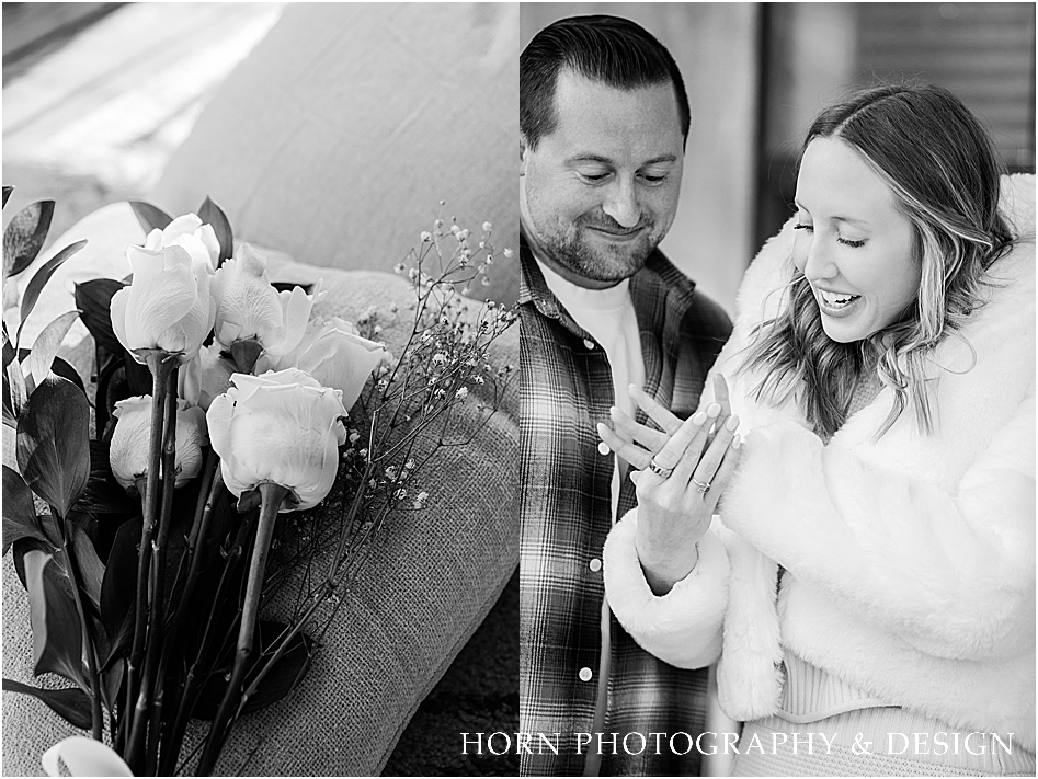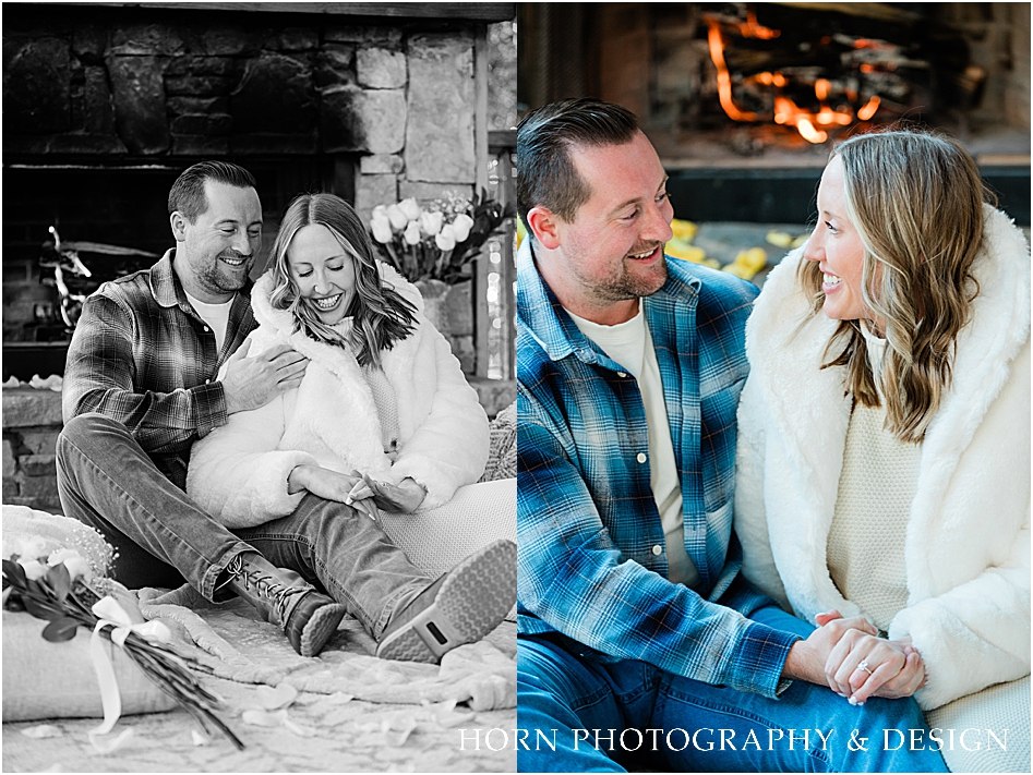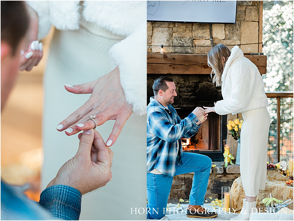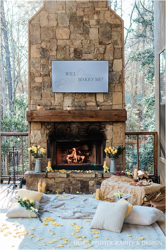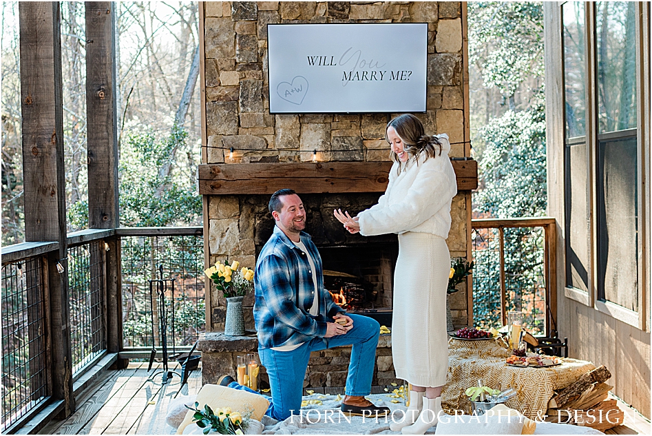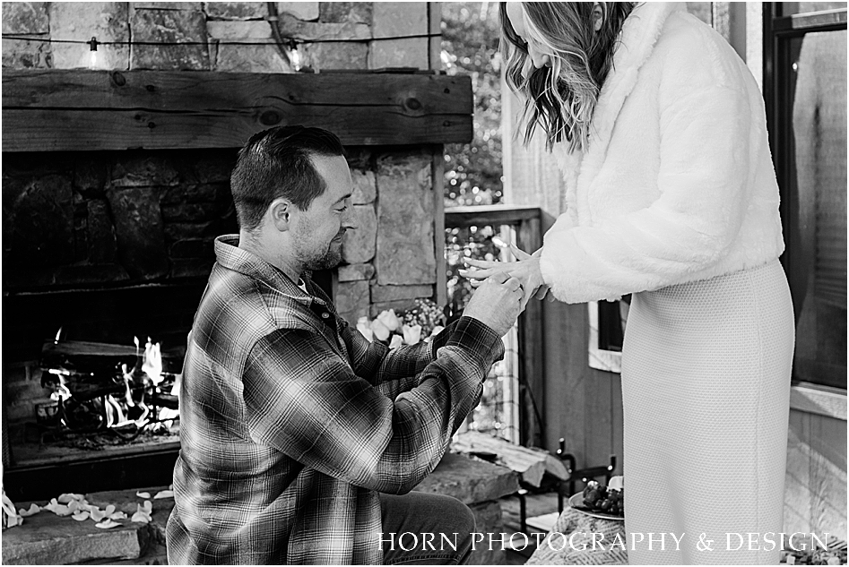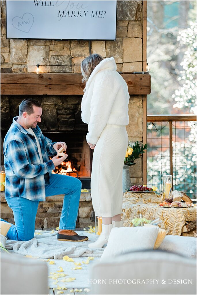 The day came and Will took Alexa to the Apple orchard while we arrived at the Air B n B to set up for the surprise proposal and then hid waiting for the moment to happen so we could document it all! The two of them came back and Will brought Alexa out to the deck where the fire was lit, candles burning and rose petals elegantly leading the way. Alexa LOVED all that he had planned. He walked her to the fire place then got down on one knee and asked for her hand in marriage.