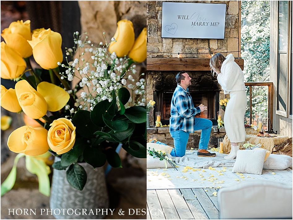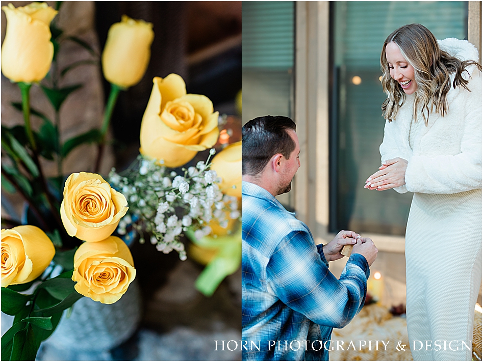Will looked through our proposal offerings and chose to go with our “She Said Yes” Collection and fabulous additions which included 2 dozen yellow roses (yellow is Alexas favorite color), a cozy blanket with pillows set up and yellow candles set up. A close friend of theirs surprised them will add on an additional dozen roses, a wonderful charcuterie board of fresh fruits, prosciutto raped cheese, assorted meats and cheeses and of corse chocolates.